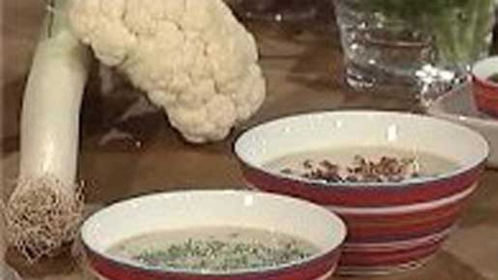 Leikkaa purjo (käytä mieluiten purjon valkeaa osaa) ja kukkakaali paloiksi ja kuullota niitä hetki öljyssä, lisää vesi ja suola sekä pippuri. Keitä miedolla lämmöllä n. 20 min tai kunnes vihannekset ovat pehmeitä. Soseuta keitto tasaiseksi sauvasekoittimella ja lisää kerma. Kiehauta keitto ja tarkista maku. Lisää ruohosipuli ja persilja juuri ennen tarjoilua.