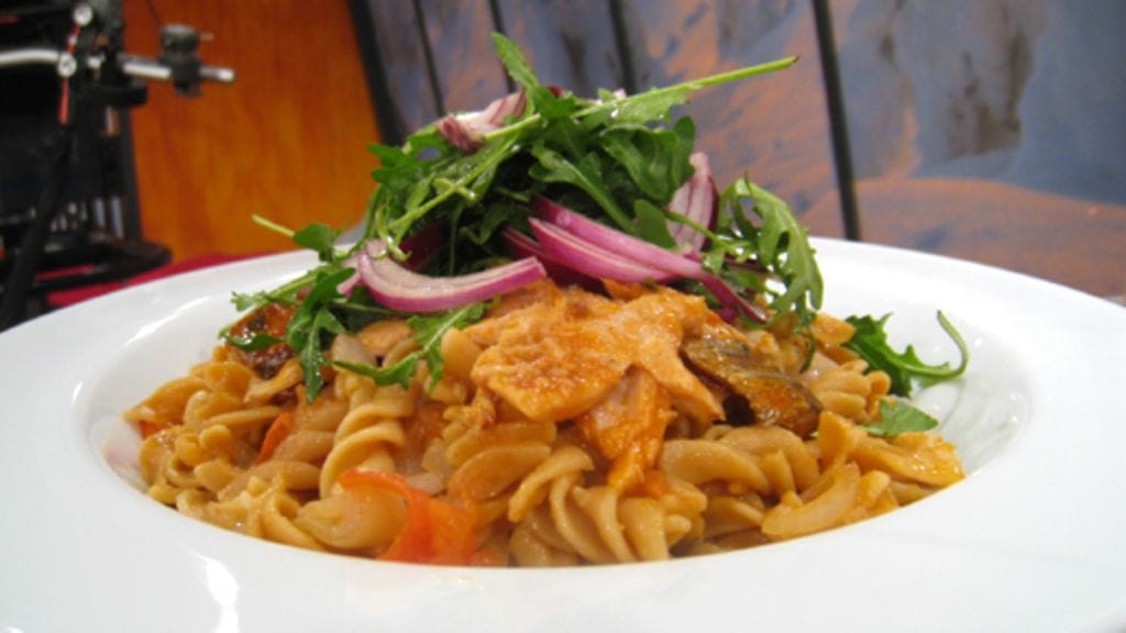 Lämmitä sardiinit nopeasti toisella pannulla. Lusikoi pastaa lautaselle ja nosta sardiinit sen päälle.