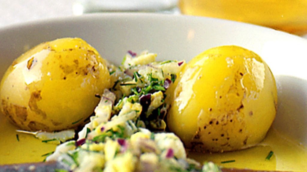 1. Kuumenna uuni 175 asteeseen. Pese perunat huolellisesti ja keitä ne kypsiksi. Kuori munat ja silppua ne. Kuori ja hienonna punasipuli hienoksi. Silppua myös tilli ja ruohosipuli. Sekoita keskenään muna- ja sipulihake sekä tilli- ja ruohosipulisilppu.