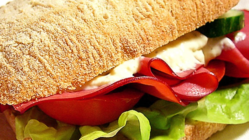 2. Huuhdo salaatti ja viipaloi tomaatit ja kurkku. Halkaise ciabattat ja jaa salaatinlehdet sekä tomaatti- ja kurkkusiivut leiville.