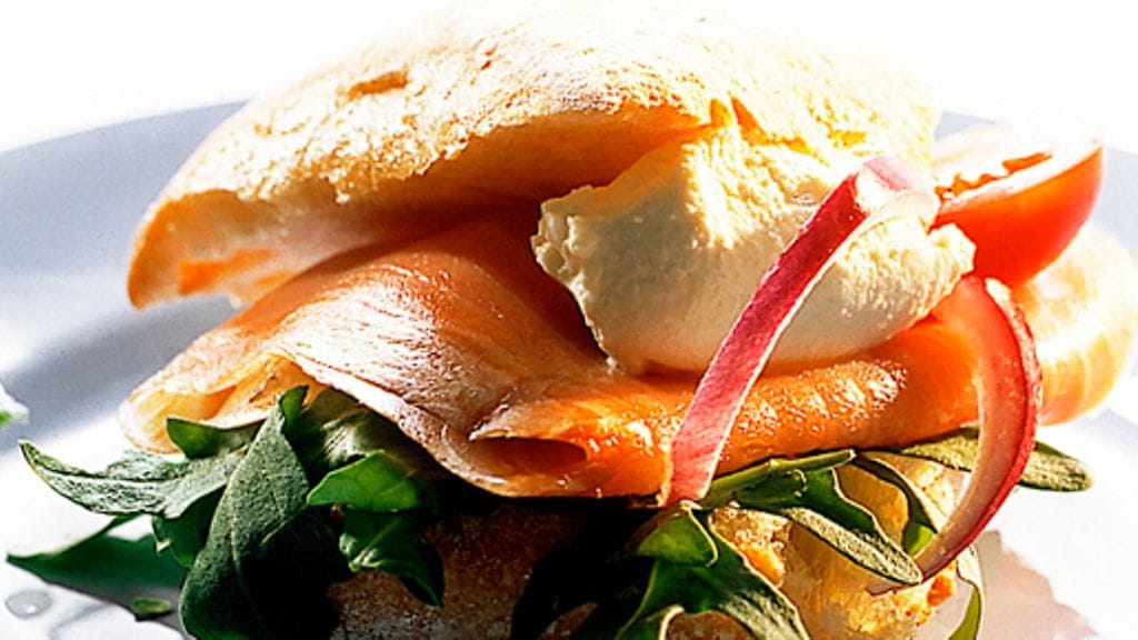 1. Puolita ciabattalleivät ja halkaise puolikkaat. Pane kannet sivuun. Levitä jokaiselle leivälle rucolan lehtiä, savulohiviipale ja kaksi ruokalusikallista piparjuurijuustoa.
