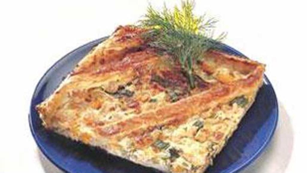 Levitä piiraan pohjalle lohisuikaleet, purjosipulirenkaat, pieniksi hakatut aurinkokuivatut tomaatit ja kuorittu parsa paloina.