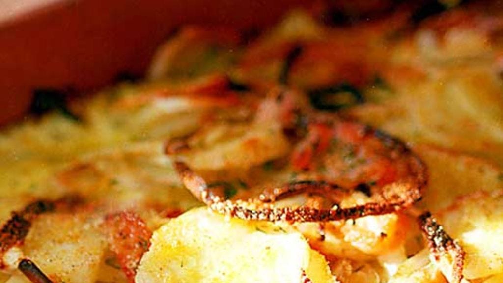 1. Kuumenna uuni 225 asteeseen. Leikkaa lohi viipaleiksi tai suikaleiksi. Viipaloi perunat. Kuori ja viipaloi sipuli. Hienonna tilli. Voitele uunivuoka. Kerrostele vuokaan perunoita, lohta, sipulia ja tilliä. Ripottele kerrosten väliin hieman pippuria.