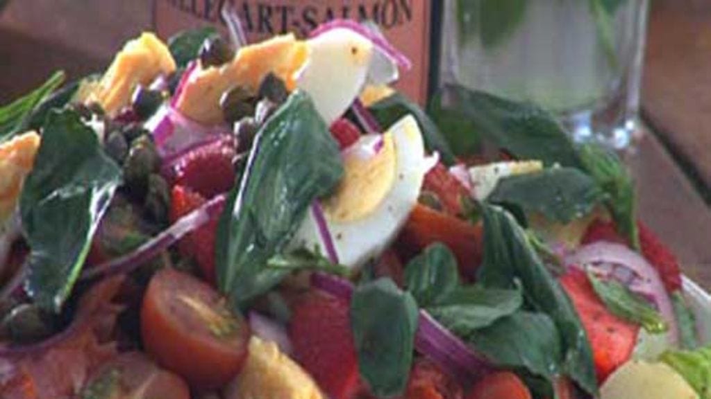 Kuori ja keitä perunat, uuden sadon perunat voi keittää kuorineen. Anna jäähtyä. Revi salaatti reilun kokoiseksi silpuksi, halkaise mansikat pitkittäissuunnassa sekä puolita tomaatit. Pilko jäähtyneet perunat pieniksi suupaloiksi. Yhdistä kaikki ainekset savulohta lukuunottamatta tarjoiluastiassa ja purista päälle sitruunan mehua.