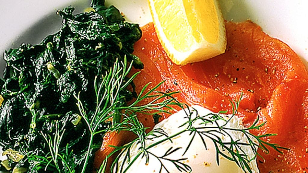 3. Pane lohiviipale lautaselle ja asettele päälle pinaattia ja uppomuna. Koristele tillillä ja sitruunalla.