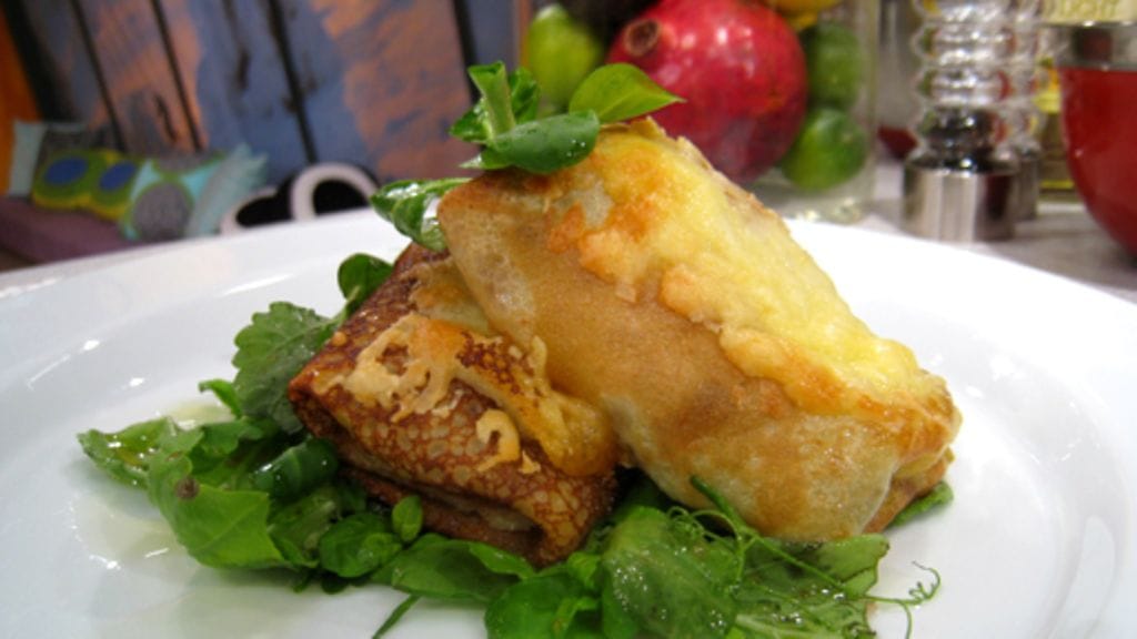 Valmista ohukaistaikina maidosta, munista ja vehnäjauhoista ja paista siitä suuria ohukaisia. Täytä ne osteritäytteellä ja taita nyyteiksi. Ripottele pinnalle vähän juustoraastetta ja kuorruta uunin grillivastuksen alla. Tarjoa lisäksi raikasta vihersalaattia.
