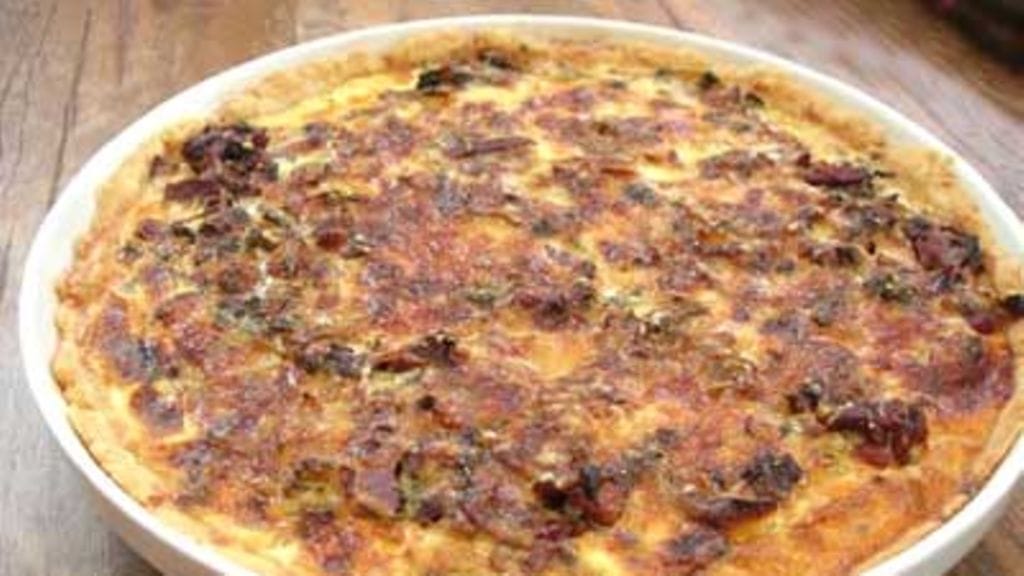 Kaada paistos tasaisesti piiraspohjan päälle. Sekoita munat kerman joukkoon ja mausta suolalla. Kaada esipaistettuun piiraaseen. Ripottele pinnalle hieman juustoraastetta ja paista uunissa noin 25 minuuttia 170°c:ssa kunnes piirakka on täysin hyytynyt pinnalta.