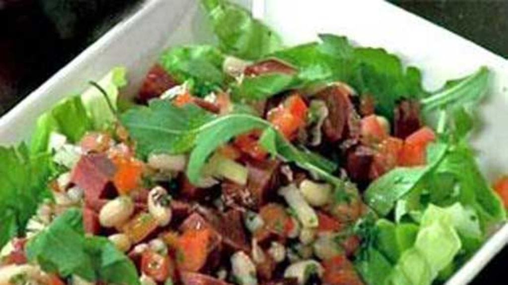 Yhdistä tomaatit, sipulit ja pavut kulhossa. Mausta oliiviöljyllä, etikalla, suolalla ja pippurilla. Sekoita ja laita hetkeksi jääkaappiin. Leikkaa kylmäsavuporo puolen sentin paksuisiksi siivuiksi ja siivut edelleen pitkiksi tikuiksi. Kokoa neljälle lautaselle jokaiselle revittyjä salaatinlehtiä. Lisää rucola ja jaa vihannessalaatti kekojen päälle. Salaatin päälle tulee kylmäsavuporosuikaleet. Pirskottele vielä oliiviöljyllä ja tarjoile. Voit tehdä vihannessalaatin etukäteen, mutta kokoa salaatit vasta juuri ennen tarjoilua. Kylmäsavuporo kannattaa kuitenkin nostaa kylmästä huoneenlämpöön hyvissä ajoin.
