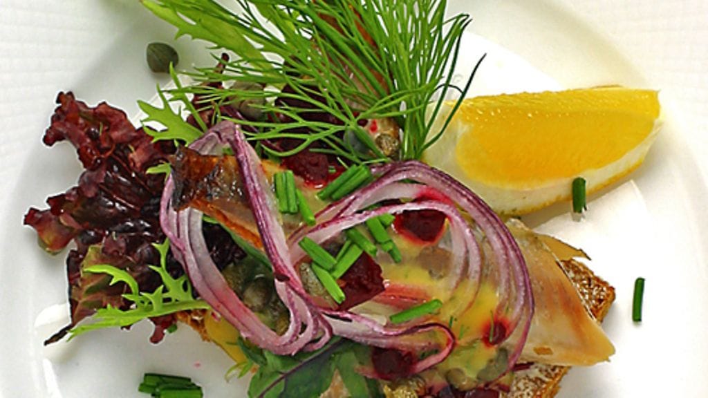 2. Kuori ja viipaloi punasipuli ohuesti, laita sipulia silakoiden päälle. Ripottele päälle kapriksia. Hienonna ruohosipulia ja ripottele päällimmäiseksi. Koristele sitruunalla ja tillillä.