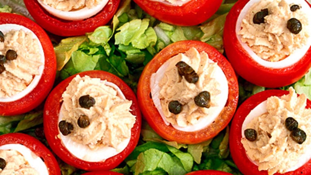 2. Halkaise munat, poista keltuainen ja laita valkuaiset tomaattien sisään.