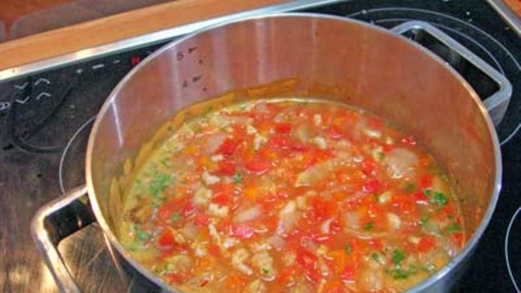 Laita sillä välin katkaravut sulamaan. Kun savustus on tehty ja pussi avattu, purista valkosipulit kuoristaan, kuori myös sipuli ja pilko nämä pieneksi. Paprika pilkotaan suikaleiksi. Kuumenna öljy kattilassa ja kuullota siinä sipulit tähtianiksen, kanelitankojen, chilin ja paprikajauheen kera. Kun ne ovat pehmenneet, kaada kattilaan valkoviini. Anna kiehahtaa ja kaada mukaan kalaliemi, johon olet liottanut sahramin. Lisää myös tomaattimurska ja anna kiehahtaa. Alenna lämpöä ja anna keiton porista rauhassa viitisen minuuttia.