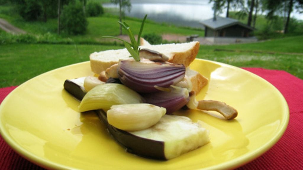 Nosta vihannekset savustuspussiin ja sulje se hyvin. Savusta grilliparilalla ja tarjoa esimerkiksi maustetun creme fraichen ja tuoreen leivän kera.