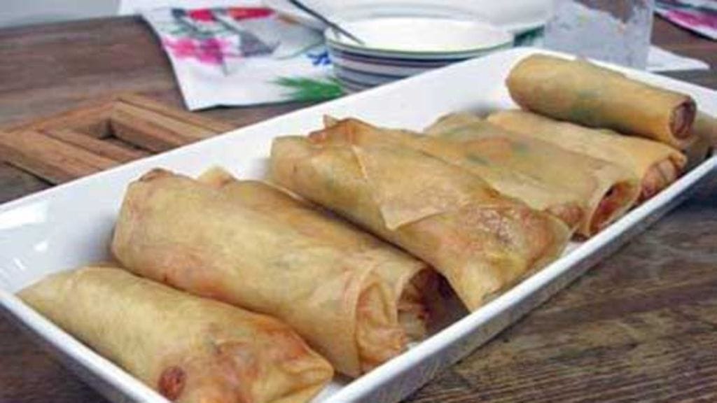 Kuori ja pilko porkkanat julienneiksi eli tulitikkumaisiksi suikaleiksi. Huuhtele ja leikkaa purjo renkaiksi. Hienonna kevät -ja valkosipulit. Sekoita kaikki aineet kulhossa ja mausta oman maun mukaan soijalla, suolalla, pippurilla ja oliiviöljyllä. Laita kaikkiin kääryleisiin täytettä siten, että jokaiseen tulee yksi scampinpyrstö. Kääri pakkauksen ohjeen mukaisesti. Kuumenna rypsiöljy kattilassa noin 160 asteiseksi ja friteeraa kääryleet kullanruskeiksi.