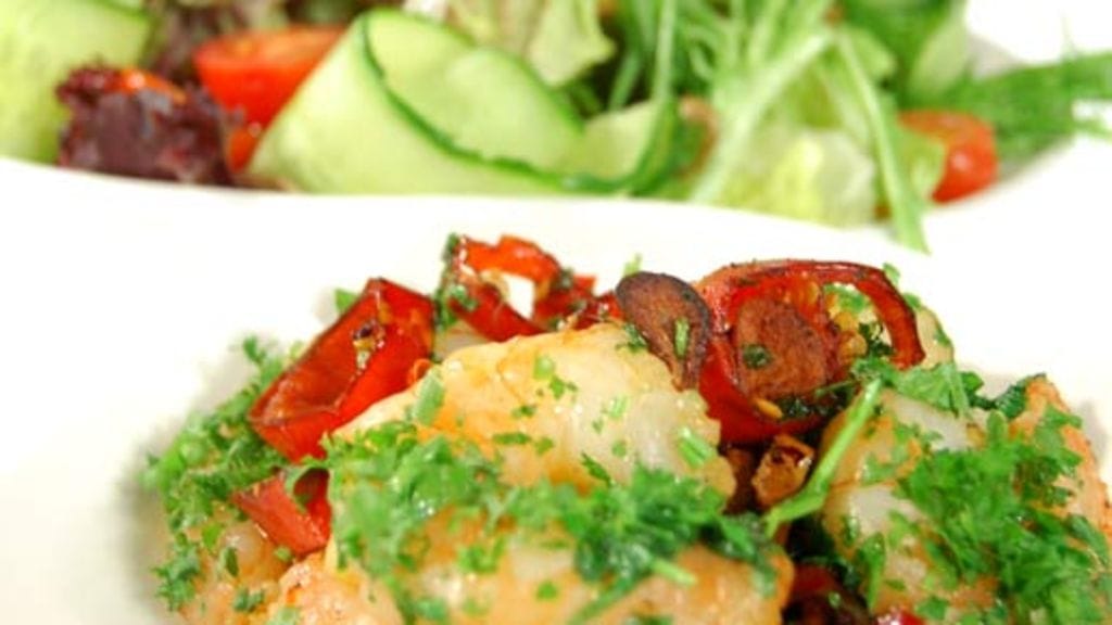Kun öljy on kuumaa lisää scampit joukkoon ja paista 30 sekuntia per puoli. Älä kypsennä liian pitkään, muuten ravut menevät ylikypsiksi ja niistä tulee kumisia. Nosta scampit reikäkauhalla pois, anna rasvan valua ja nosta lämpimät ravunpyrstöt salaatin pinnalle.