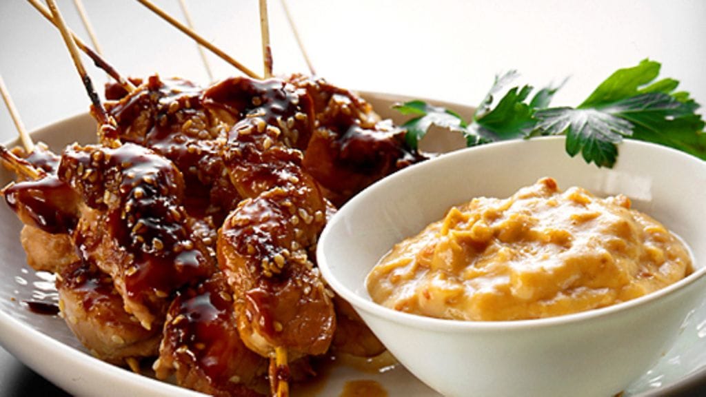 2. Kastike: Hienonna maapähkinät. Kuori ja hienonna sipuli ja valkosipuli ja kuullota ne öljyssä. Lisää joukkoon kookosmaito, sambal, currytahna, sokeri ja kalakastike ja keitä sekoittaen 2 minuuttia. Lisää maapähkinähake ja -voi. Keitä hiljaa ilman kantta 30 minuuttia silloin tällöin sekoittaen. Lisää kastikkeeseen sitruunamehu. Pujota marinoidut lihapalat vartaisiin.