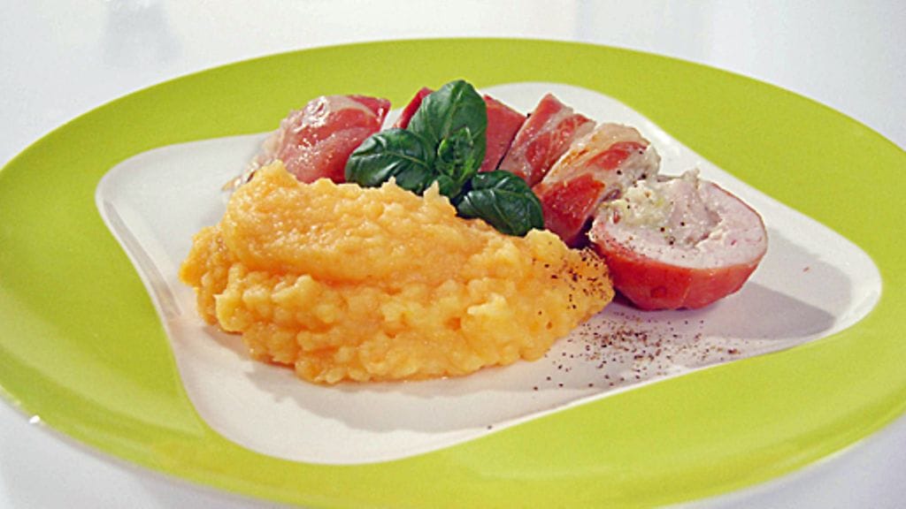 Levitä tuorekelmua leikkuulaudalle, laita 3 siivua kinkkua kelmun päälle ja nosta kaksi halkaistua filettä kinkkujen päälle. Levitä täytettä fileelle ja rullaa kelmun avulla tiukaksi paketiksi. Kääri rullat uuteen kelmuun, muotoile niistä pyöreitä ja solmi kelmun päät tiukasti pakettiin. Kypsennä kääreet kiehuvassa vedessä 10-12 minuutin ajan ja jäähdytä kypsät rullat huoneenlämmössä tai kylmässä vedessä.