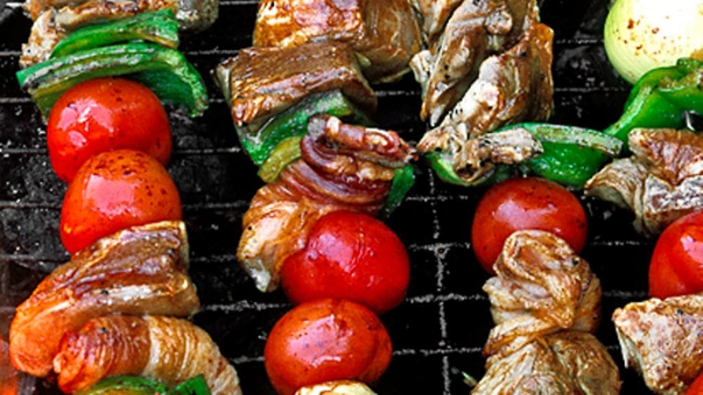 3. Pujottele vartaisiin valutettuja lihapaloja, sipulia, paprikaa, tomaatteja ja pekonikääröjä. Penslaa marinadilla ja grillaa hitaasti kypsiksi.