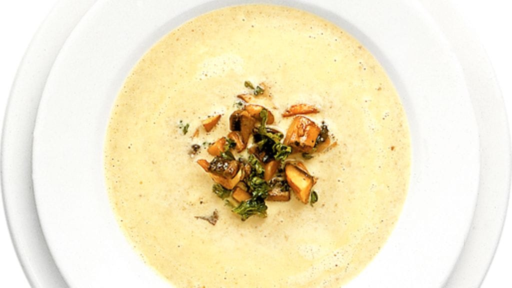 2. Keitä kirkasta lihalientä ja kasvislientä kattilassa, kunnes jäljellä on puolet alkuperäisestä määrästä. Lisää kerma ja jatka keittämistä, kunnes lihaliemestä on jäljellä 3/4. Puhdista ja puolita herkkusienet. Säästä muutama herkkusieni koristelua varten. Soseuta loput herkkusienet tehosekoittimella. Anna tehosekoittimen käydä 20-30 sekuntia suurimmalla teholla.