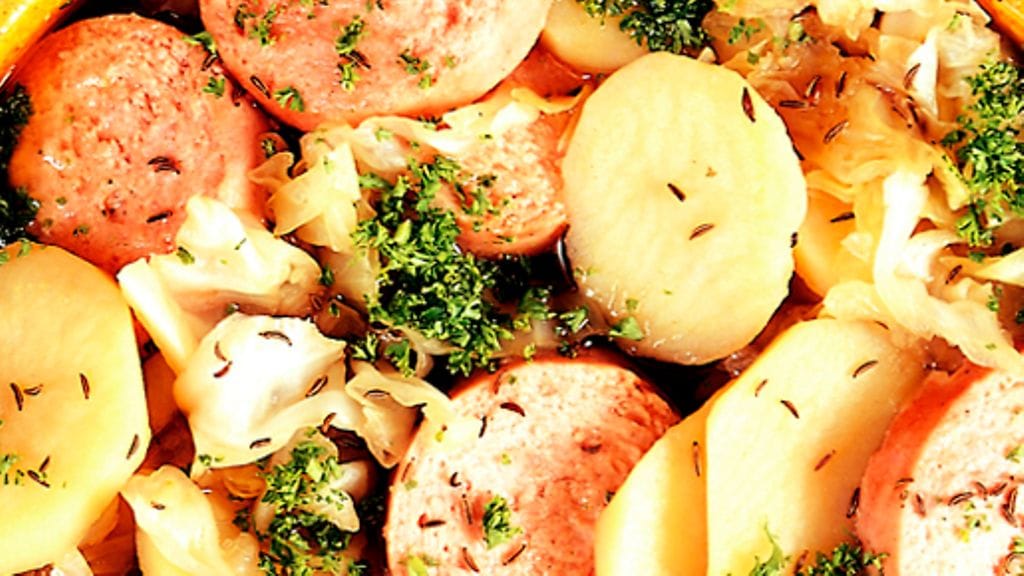 1. Kuori ja viipaloi perunat. Lado perunat ja kaali pataan kerroksittain.