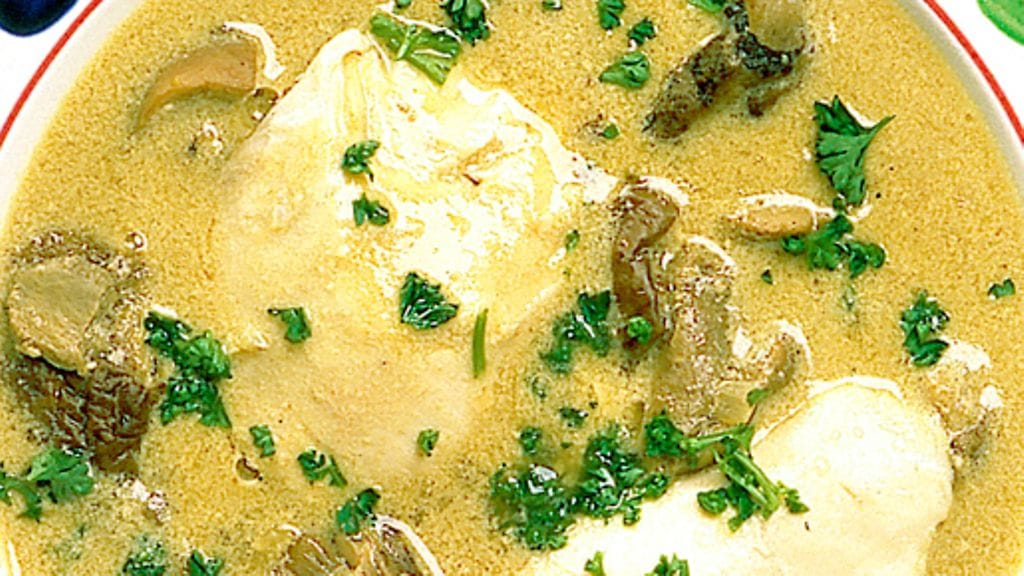 2. Puhdista sienet ja leikkaa ne sopivan kokoisiksi paloiksi. Kuori ja hienonna toinen sipuli. Hienonna persilja. sulata padassa voi niin, että se saa hieman väriä. Kuullota sipuli kevyesti, lisää joukkoon sienet ja hauduta seosta noin kymmenen minuuttia koko ajan sekoittaen. Kaada joukkoon keitinliemi ja keitä ilman kantta, kunnes lientä on jäljellä 3/4 alkuperäisestä määrästä. Leikkaa broileri pienemmiksi paloiksi ja pane palat keittokulhoon.