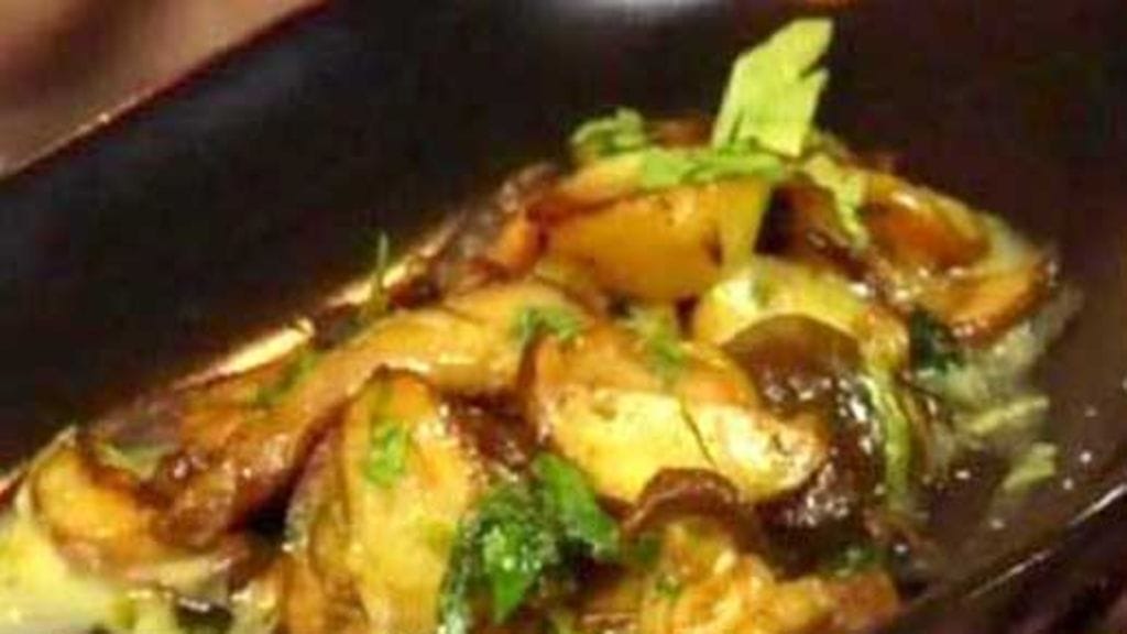 Pyyhi sienet puhtaiksi, älä pese niitä. Viipaloi sienet. Ruskista sieniä voisulassa noin 5 minuuttia. Lisää joukkoon persilja ja curry ja mausta suolalla ja pippurilla. Nosta kattila levyltä.