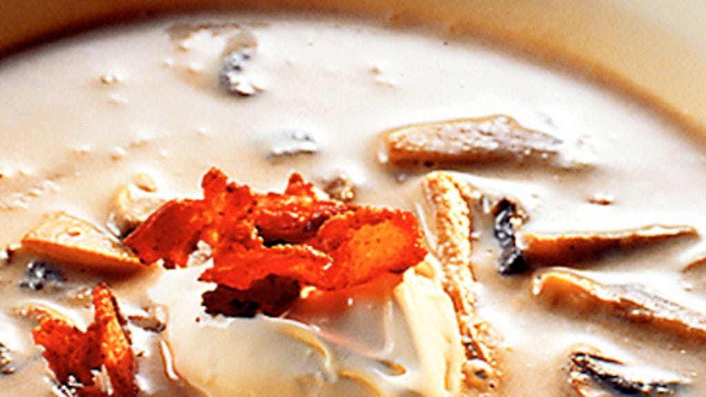 3. Mausta keitto suolalla ja pippurilla, vatkaa mukaan puolet ranskankermasta. Kuumenna viimeisen kerran kiehuvaksi, kaada sitten keitto lämpimille lautasille. Tarjoile kylmän ranskankermanokareen ja suikaloidun, rapean pekonin kera.