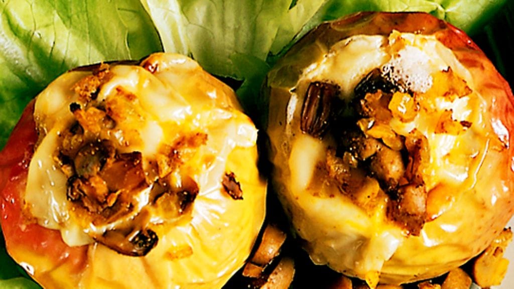 2. Koverra omenista kodat mutta jätä pohjaan pala. Aseta omenat pystyyn uunivuokaan. Täytä ne sieniseoksella ja asettele loput täytteestä omenien ympärille.