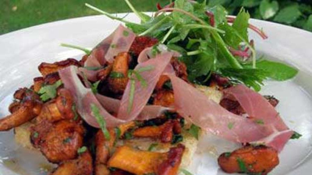 Pese, kuivaa ja hienonna sienet leikkaamalla tai repimällä. Sulata voi isossa pannussa ja paista sieniä keskilämmöllä noin viisi minuuttia. Sekoita joukkoon valkosipuli ja persilja. Lisää sitruunamehu ja etikka, mausta suolalla ja pippurilla. Sekoita hyvin. Paista vielä viitisen minuuttia. Nosta pannu levyltä ja lisää joukkoon korianteri. Leikkaa kinkun siivut ohuiksi suikaleiksi.