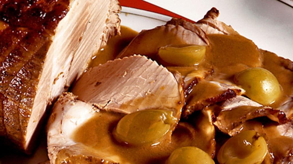 3. Nosta liha vuoasta. Vatkaa maut vuoasta siivilöidyllä marinadilla ja siivilöi uudestaan. Säästä rypäleet. Paista margariinia ja jauhoja kastikkeeseen kattilassa. Lisää liemi ja kerma, mausta ja keitä 10 minuuttia. Lisää rypäleet.