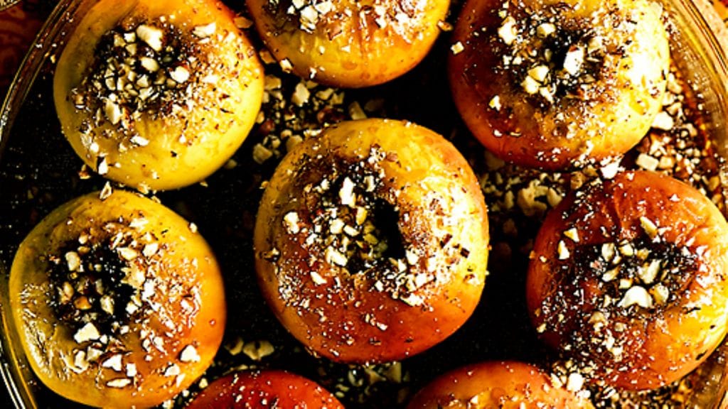 3. Hienonna pähkinät ja ripottele ne omenoille ennen tarjoilua, tarjoile vaniljakastikkeen kera.