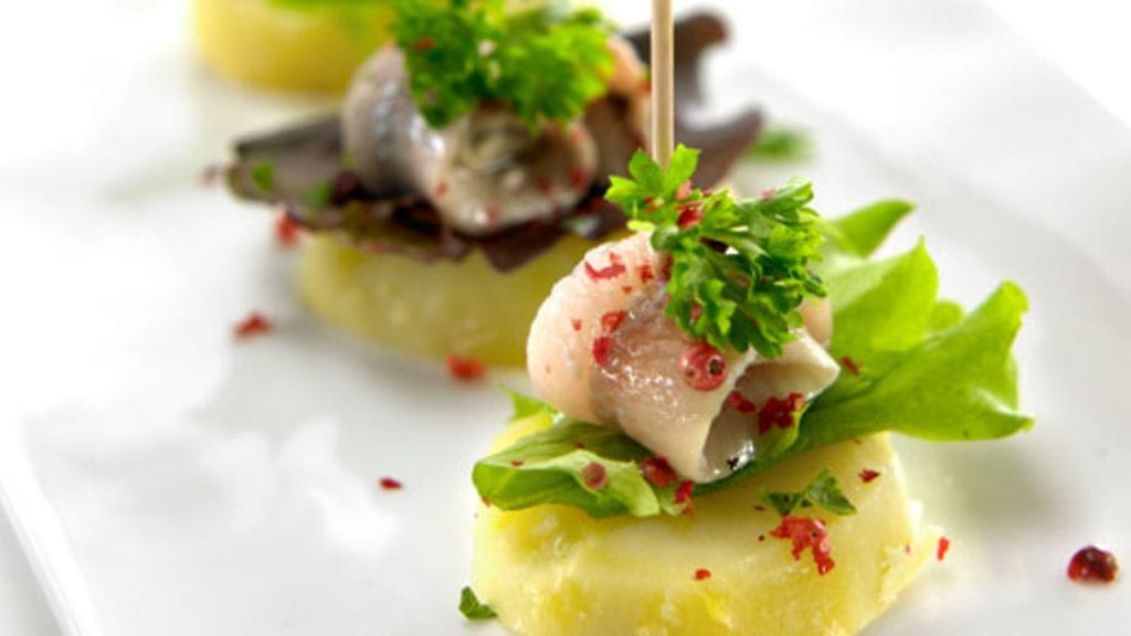 Sipaise jokaiselle perunaviipaleelle valkosipulituorejuustoa ja aseta sopivan kokoiseksi revittyä salaatinlehteä. Kiinnitä päälle cocktailtikun avulla rullalle kääräisty, marinoitu silakkafilee.