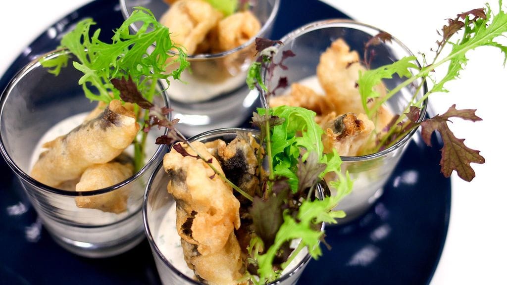 Laita friteerausöljy kuumenemaan. Valmista ensin tempurataikina. Sekoita suola ja vehnäjauho. Ilmaa seos siivilän läpi. Sekoita varovasti jääkylmän vichyn kanssa. Älä sekoita liikaa koska muuten taikinaan kehittyy sitkoa. Lisää muutama jääpala että taikina on varmasti kylmää.