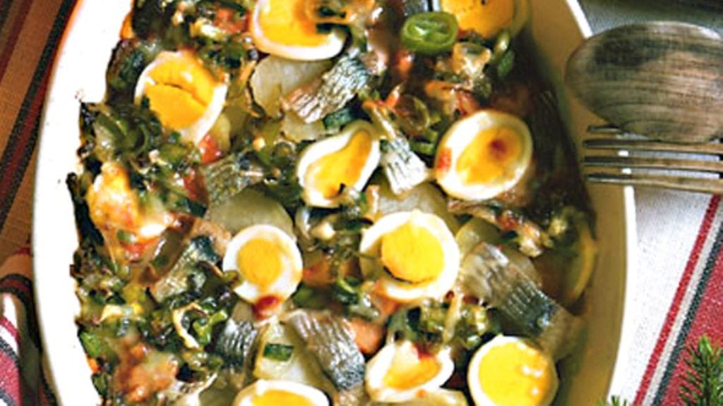 3. Paista purjo pehmeäksi voissa ja laita sillien päälle munaviipaleiden kera.