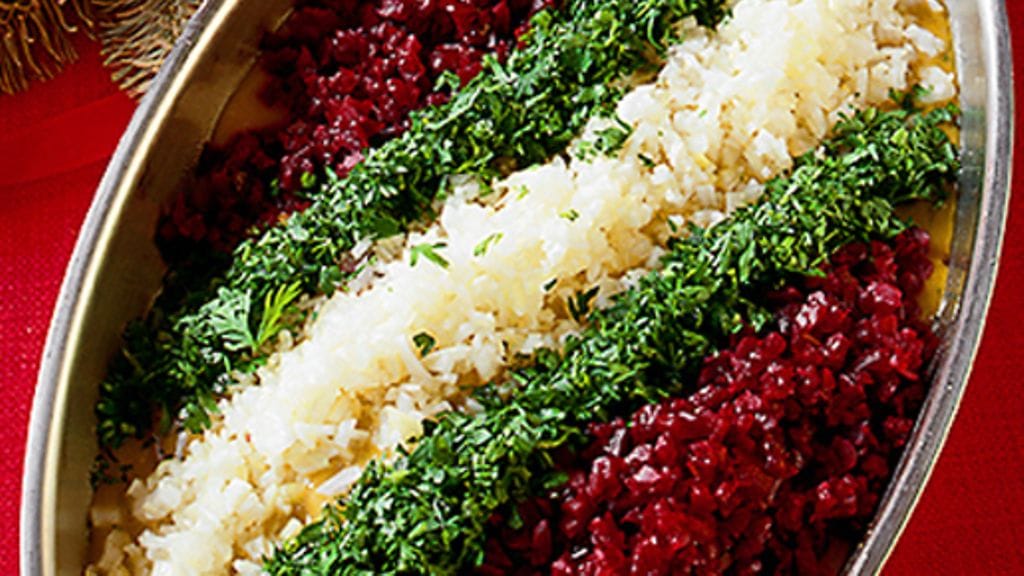 3. Kuori ja silppua sipuli. Pilko kurkut. Yhdistä hakkeet ja levitä raitana vinosti sillivadin päälle. Asettele tilli- ja punajuurisilput raidoiksi sipuli-kurkkuraidan sivuille.