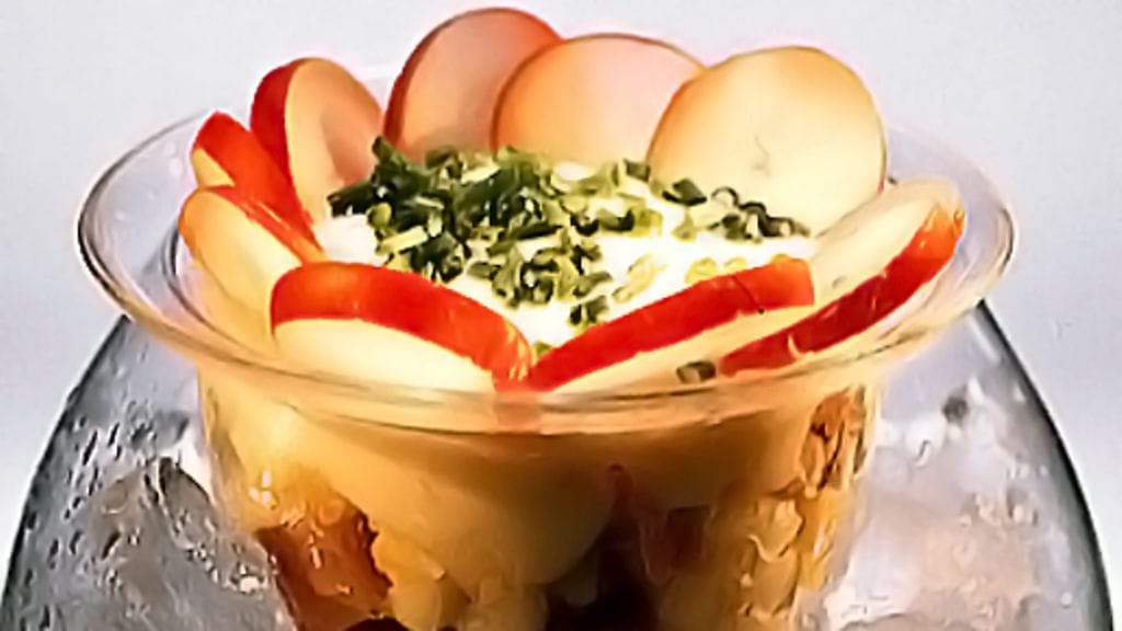 2. Lusikoi päälle kermaviiliä ja hienonnettua ruohosipulia. Viipaloi retiisit ohuesti ja koristele cocktail niillä.