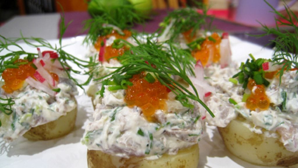 Viipaloi perunat noin yhden sentin viipaleiksi. Aseta lusikallinen sillisalaattia peruna viipaleen päälle. Koristele mädillä, ruohosipulilla ja tillillä. Nauti huurteisen oluen kera alkuruokana tai iltapalana.