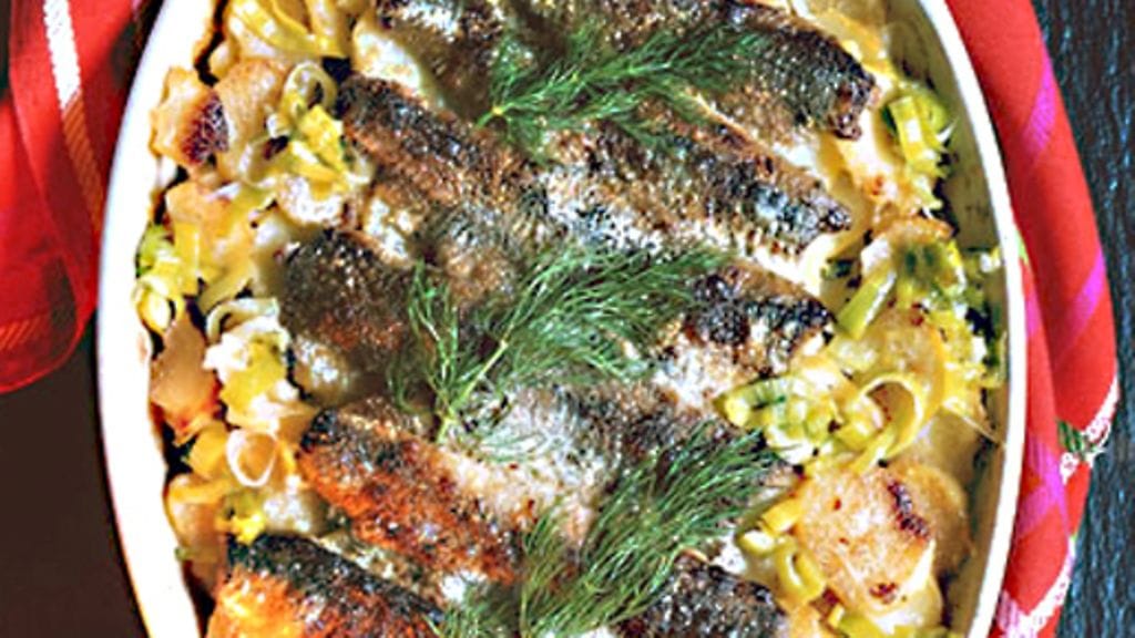 1. Kuumenna uuni 225 asteeseen. Lado perunaa ja purjoa uunivuokaan, sekoita mätitahna ja kerma ja kaada vuokaan.