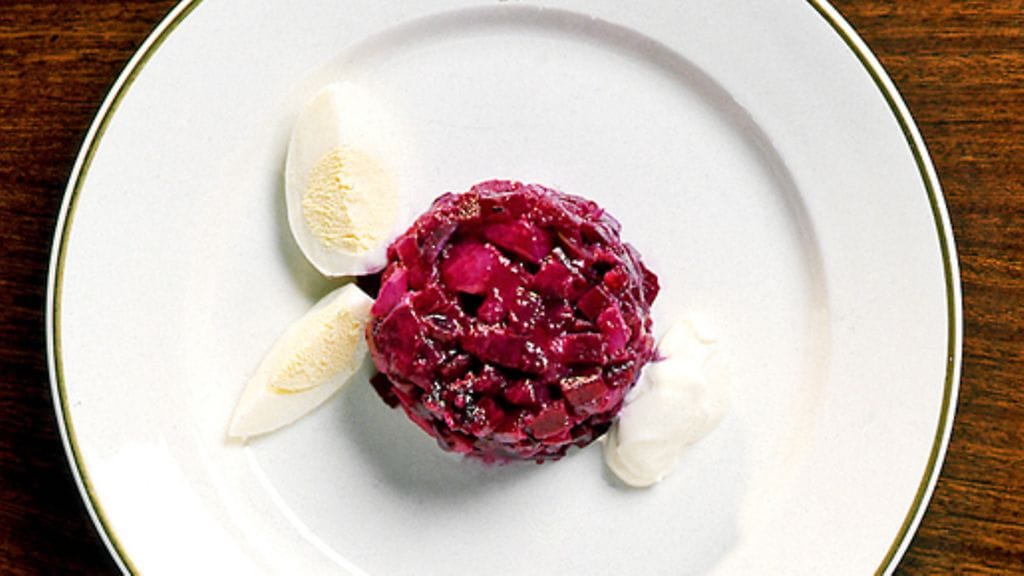 2. Leikkaa sillifileet, perunat, kurkut, omenat ja punajuuret pieniksi kuutioiksi. Hienonna sipuli. Mausta suolalla ja pippurilla. Sekoita ainekset hyvin. Kääntele sinappikastike seoksen joukkoon.