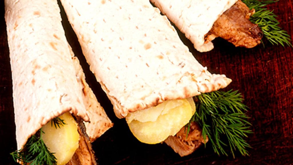 2. Voitele rieskat voilla, aseta jokaiseen päälle perunaviipaleita ja sillifilee sekä tilliä ja kääri tötterölle.