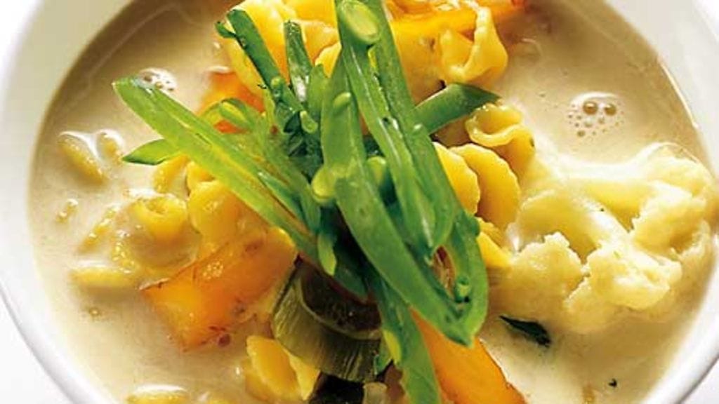 2. Keitä kukkakaali, porkkana ja sipuli liemessä, lisää pasta. Keitä n. 8 minuuttia kunnes pasta ja vihannekset ovat pehmenneet.