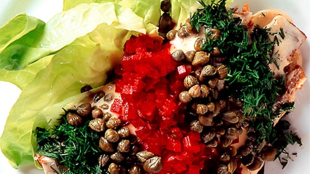 2. Perkaa savusilakat. Kuutioi punajuuret ja levitä ohut kerros margariinia leipäviipaleille. Levitä päälle savusilakkaa, aseta päälle lusikalinen kastiketta ja koristele kapriksilla, punajuurella ja tillinoksilla.