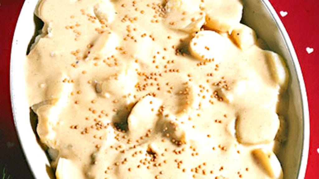 4. Kääntele varoen kala ja viipaloidut perunat kastikkeeseen, kuumenna ja ripottele päälle sinapinsiemeniä ennen tarjoilua.