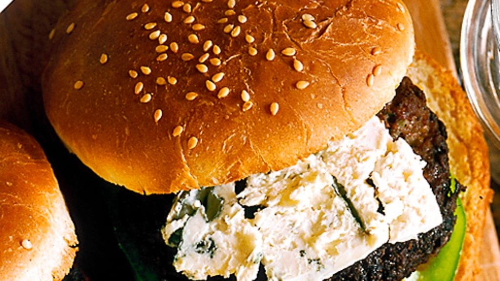 3. Lämmitä sämpylät. Laita pihvit hampurilaissämpylöiden väliin, peitä viipaloidulla sinihomejuustolla ja paprikarenkailla.