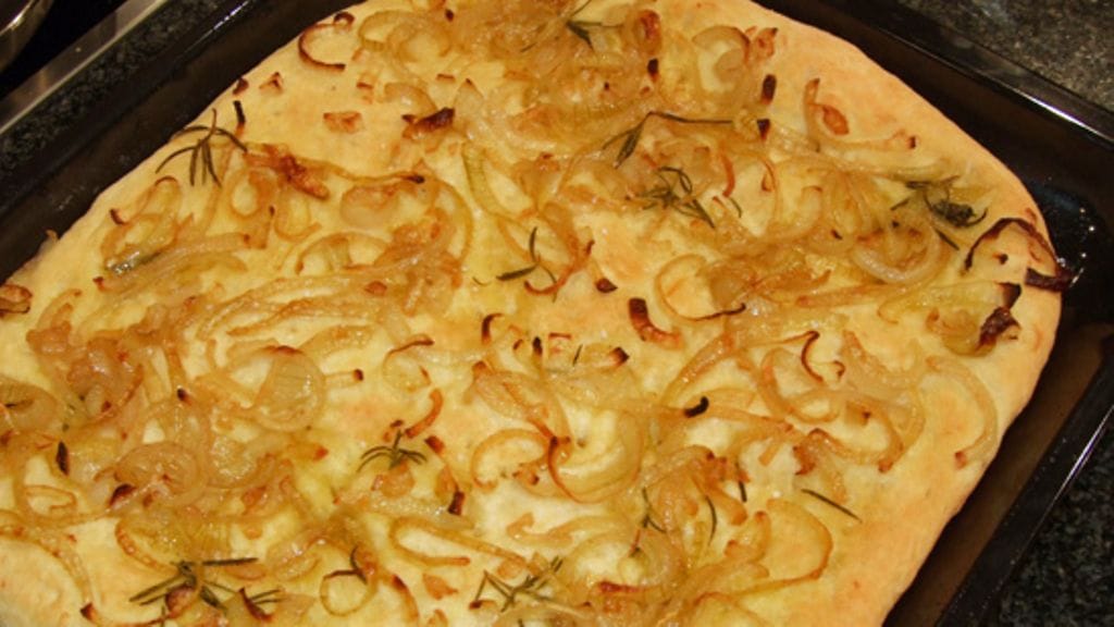Kaulitse kohonneesta taikinasta pellin kokoinen levy, nosta se pellille ja kaada päälle öljy-sipuliseos. Levitä seos tasaisesti koko leivälle ja painele taikinaan sormilla kuoppia.