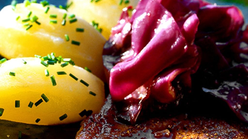 3. Nosta pihvit tarjoiluvadille tai lämpimille lautasille. Kiehauta sipulit uudestaan ja jaa ne kuumina pihvien päälle, ripottele pinnalle persiljasilppua ja tarjoile heti vastakeitettyjen perunoiden kanssa.