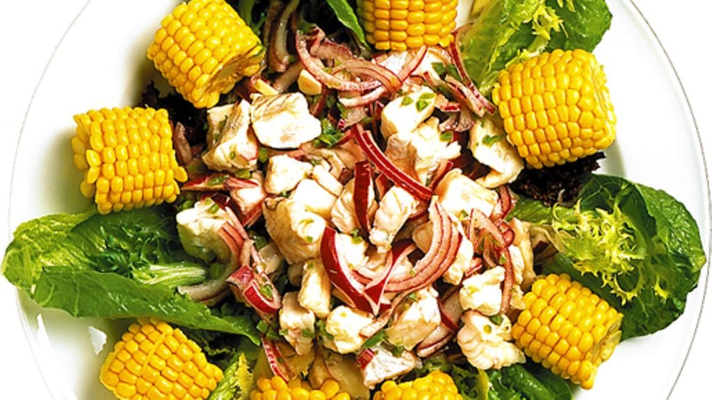 3. Keitä maissintähkiä kevyesti suolatussa vedessä 20 minuuttia. Suikaloi toinen sipuli. Asettele salaatinlehdet lautasille ja nosta kala lehtien päälle. Paloittele maissintähkät. Koristele maissilla ja sipulilla.