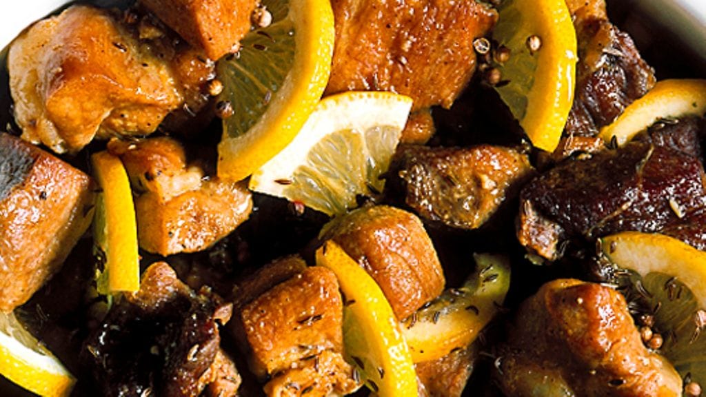 1. Mausta lihat suolalla ja pippurilla. Ruskista palat hyvin ja laita ne pataan. Ripottele päälle mausteet, lisää valkosipuli ja murusta mukaan liemikuutio.
