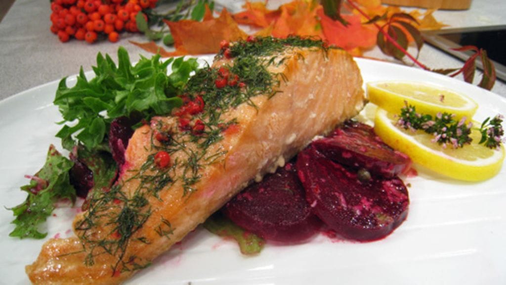 Laita filee uuniin ja kypsennä 20 minuuttia kunnes kala on kypsää. Nauti punajuurisalaatin kera.
