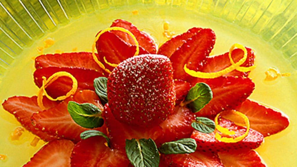 3. Asettele viipaloidut mansikat kauniisti neljälle lautaselle. Koristele kokonaisilla marjoilla, sitruunankuorella ja mintunlehdillä. Puuteroi päälle tomusokeria.