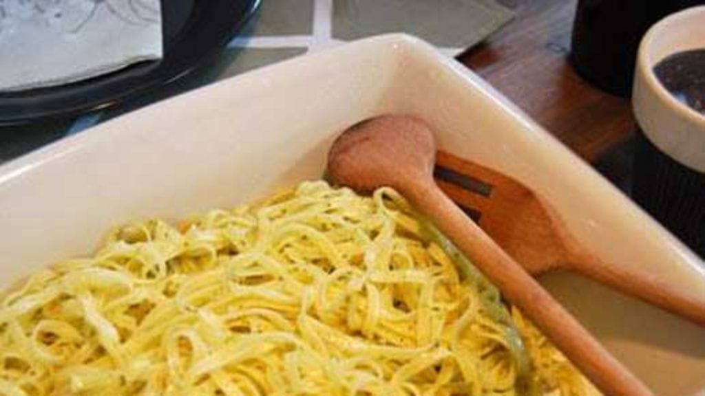 Sekoita kaikki raaka-aineet tehosekoittimessa ja lisää öljy vähitellen ohuena nauhana. Laita pasta kiehumaan runsaasti suolattuun veteen. Kun pasta on al dente, sekoita siihen pesto ja tarjoa raastetun parmesaanin kera. Halutessasi voit puristaa pastaan lisää sitruunan mehua pöydässä.